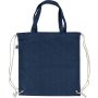 Újrahasznosított farmeranyagból készült húzózsinóros táska 40 × 38 cm méretben, 2,5 × 50 cm hosszúságú fülekkel és húzózsinóros záródással. A külső felületen újrahasznosított alapanyagra utaló címke található, vállpántként vagy kézi hurokként is hordható.