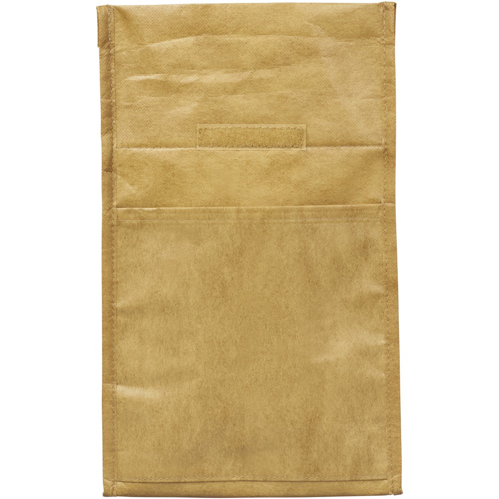 Papír hatású nyomattal rendelkező hűtőtáska. Bélelt fő rekesszel és Velcro?, azaz tépőzáras záródással.
