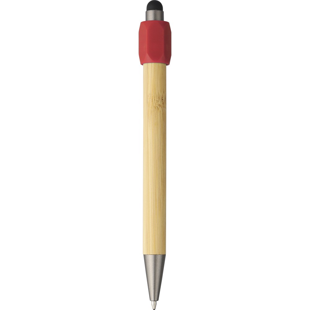 Bambusz golyóstoll újrahasznosított ABS pörgettyűvel és fekete érintővel a nyombógombon. A tollhegy vastagsága 1.0 mm, íráshossz: kb. 800 méter. Az újrahasznosított anyagra utaló logó a tollra van gravírozva.