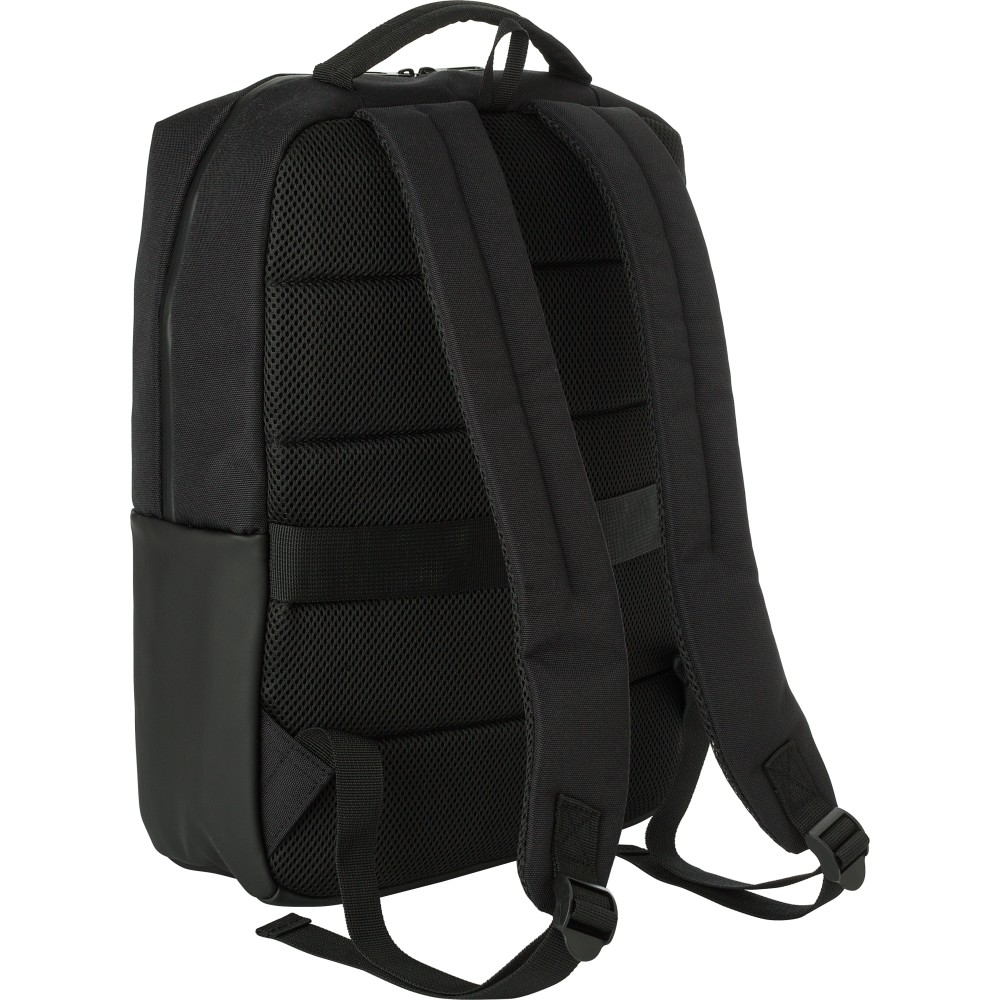 Poliészter (600D) laptophátizsák (15 colos). Egy nagy cipzáras rekesz a tetején, belül több rekesszel. Kis cipzáras rekesz az elején. Megerősített hátoldal és állítható pántok.