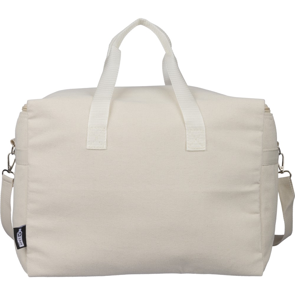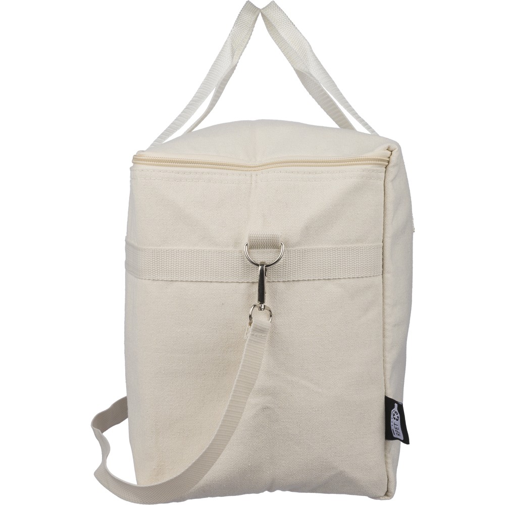 Újrahasznosított pamut-poliészter 330 g/m2 kevertszövetből készült hűtőtáska alumíniumfóliás szigeteléssel, 23 literes űrtartalommal. 60 cm hosszúságú és 3,5 cm szélességű fülekkel, 110 cm hosszúságú és 2,5 cm szélességű állítható vállpánttal, fémcsattal és a táska színével megegyező hevederrel rendelkezik. Külső felületén rPET címkével, belső részében további címkével ellátva.