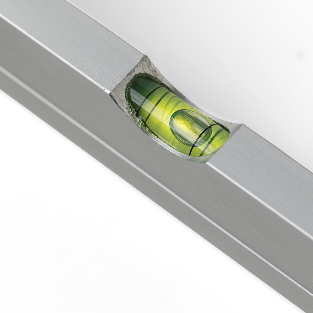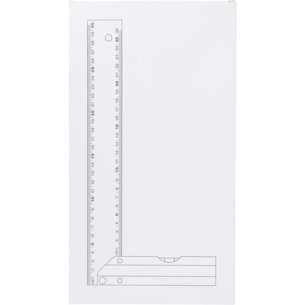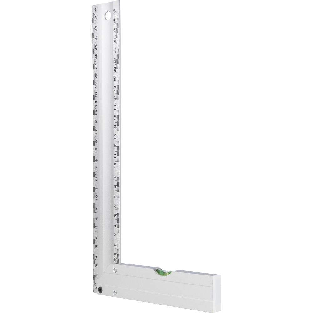 Alumíniumból készült derékszögmérő szintezővel, 30 cm hosszúsággal, centiméter beosztással. Praktikus kialakítás a pontos méréshez és szintezéshez. Darabonként illusztrációval ellátott barna kartondobozba csomagolva.