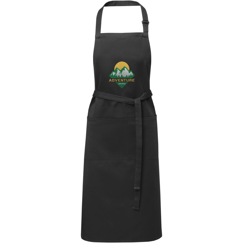 Vastag és masszív anyag, ugyanakkor puha és kényelmes viselet. A két elülső zseb gyors és egyszerű módot kínál a konyhai eszközök tárolására. A kötény nyakában csattal állítható, hátul megköthető. Nagyméretű nyomtatási lehetőség a logók megjelenítéséhez. Pamut twill 65% poliészterből és 35% pamutból, 240 g/m2.