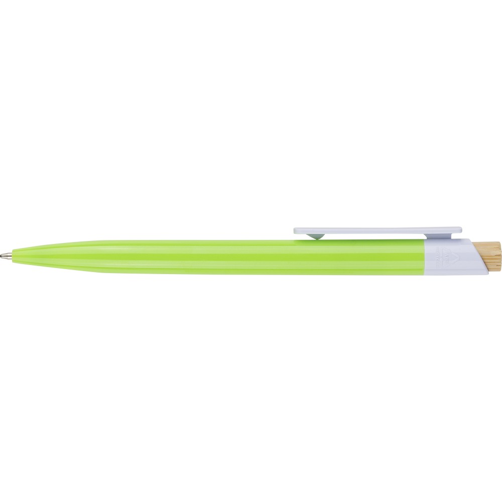 Újrahasznosított ABS-ből készült golyóstoll bambusz nyomógombbal és fehér klippel, digitális nyomtatásra alkalmas kivitelben. A tolltesten fröccsöntés során elhelyezett recycled (újrahasznosított) alapanyagra utaló logó található. Megközelítőleg 600 méter íráshosszúságú, kék színű tollbetéttel.