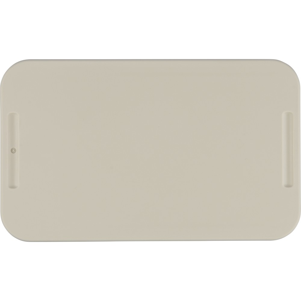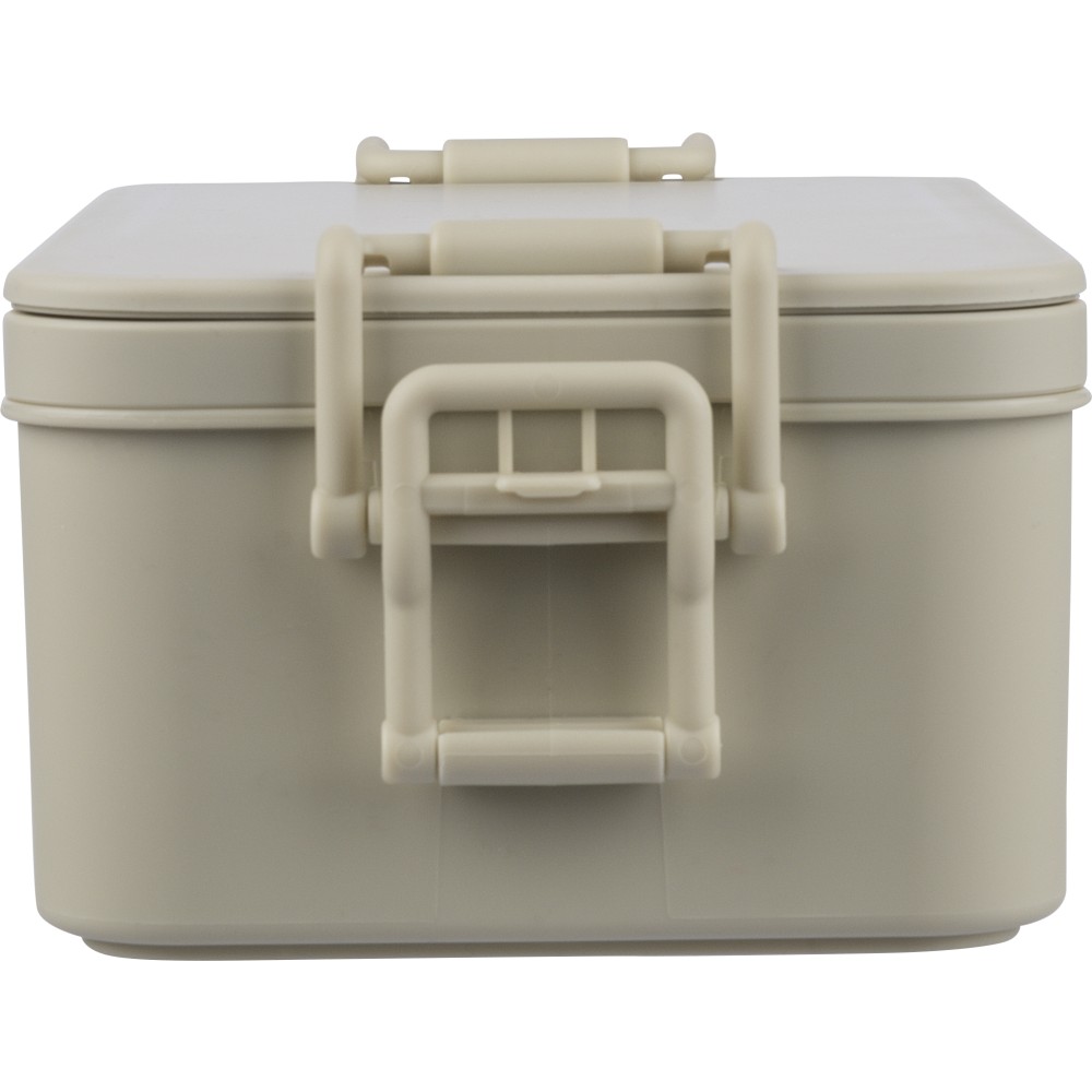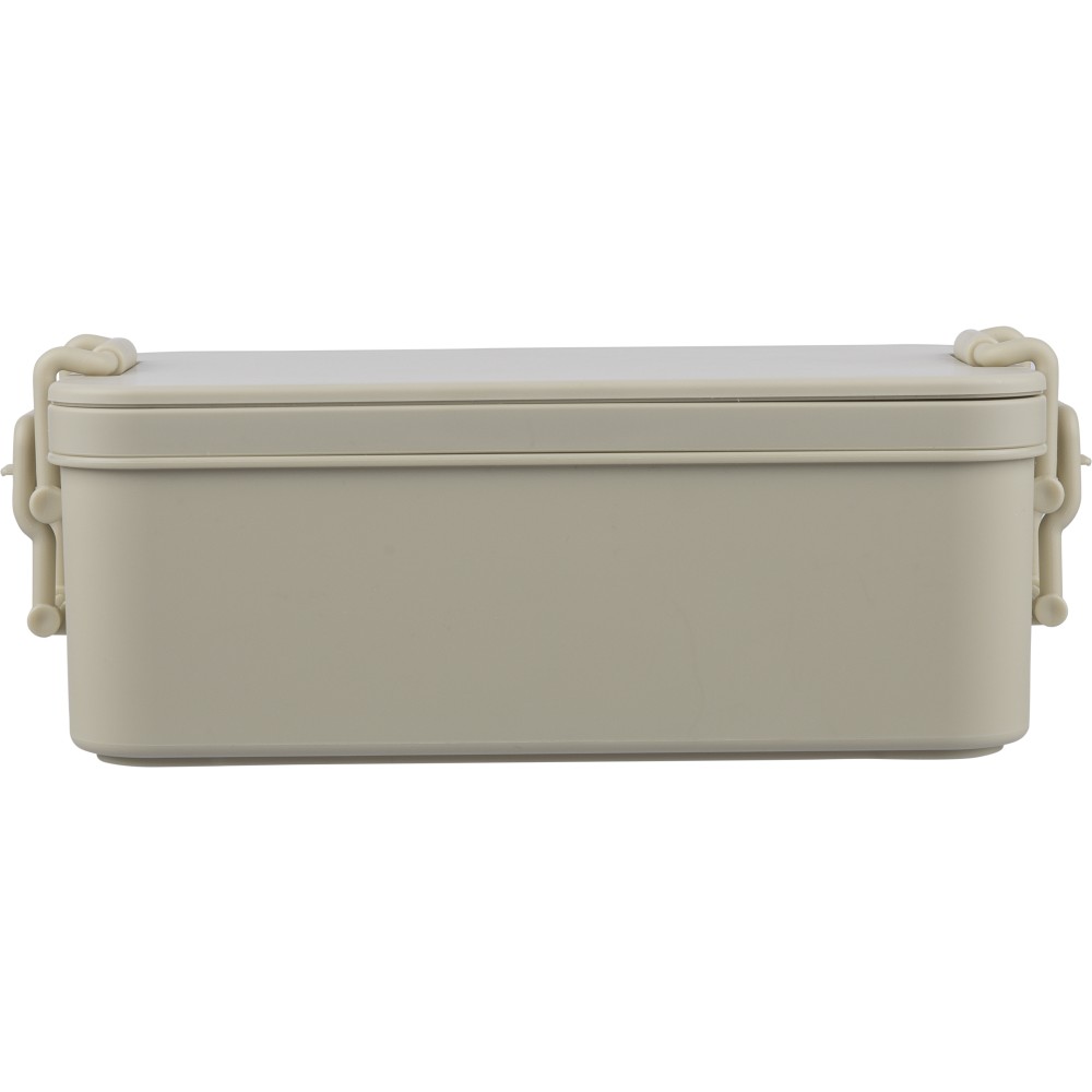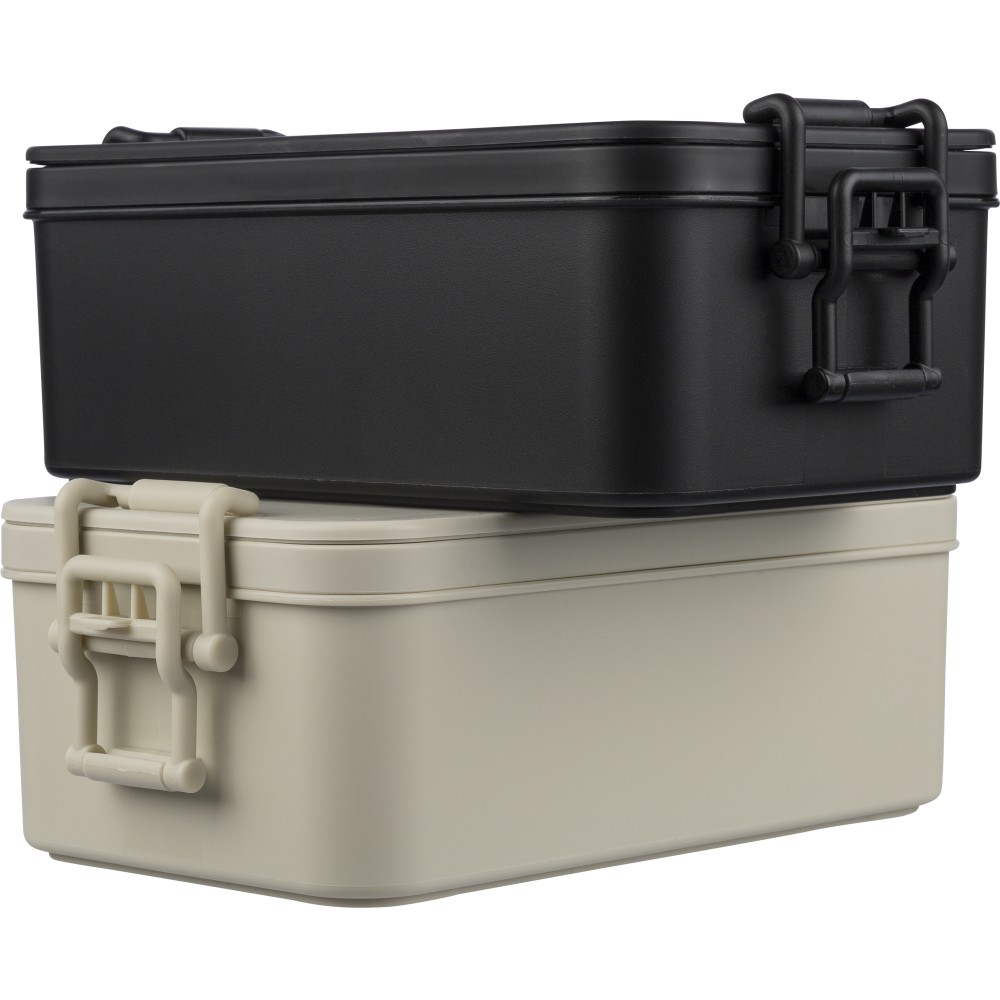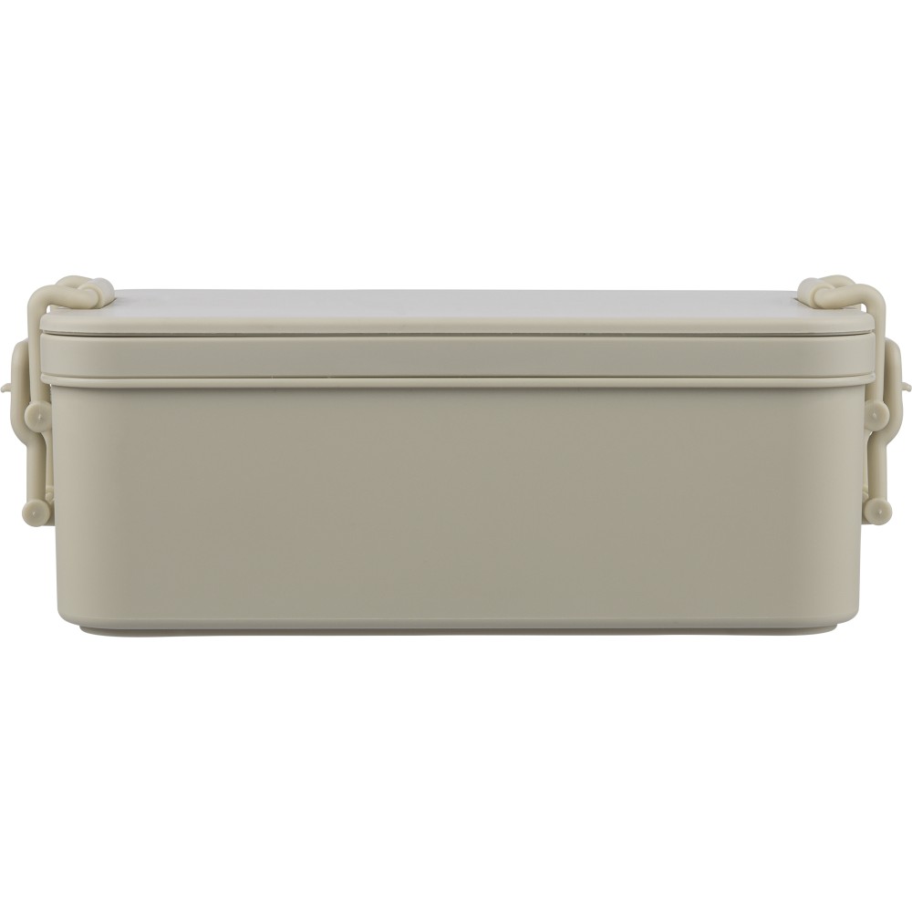 PP anyagból készült, két szintes ételtároló doboz csatos záródással és PP fedéllel. A kisebb alsó rekesz a helytakarékosság érdekében a felsőbe illeszthető. Köztes réteggel rendelkezik, amely háromrészes evőeszközkészletet tartalmaz. Űrtartalma 2 200 ml. Nincs egyenként csomagolva.