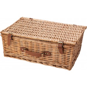 Piknikkosár 4 fő részére. Rozsdamentes acél evőszközök műanyag nyéllel, 4 darab kerámia tányér és 4 darab 0,21 literes kerámia bögre. A termék természetes anyagokból készült, ezért méreteiben eltérések adódhatnak.