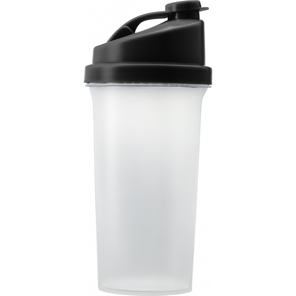 Műanyag protein shaker (kb. 700 ml-es) szűrővel és színes fedéllel, egyik oldalán ml, másik oldalán OZ beosztással. Nem szivárgásmentes. Mosogatógépben nem tisztítható. BPA-mentes műanyag.